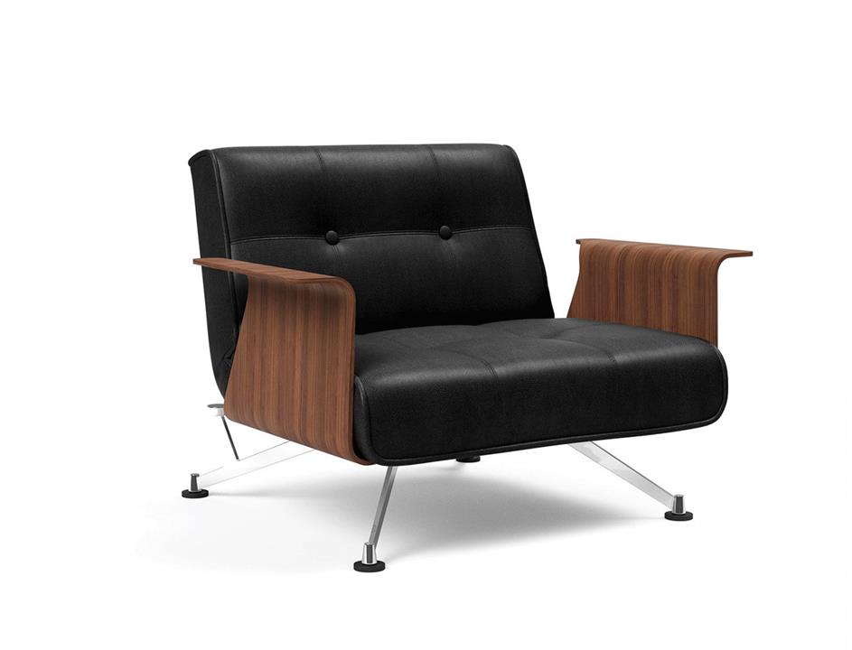 The Clubber Chair with Walnut Arms from Innovation Living is part of the sofa-bed range that exude timeless style and elegance. This single seater club-style upholstered and sticthed chair sitting on chrome legs features button embellishments and strong walnut curved arm rests showing off the grain, with a large cushion seating spot for comfort. It’s perfect for your modern mid-century inspired decor where extra seating is required (see measurements below). For convenience, the Clubber will convert to a small sofabed, perfect for children staying over unexpectedly. The Clubber’s fabric upholstery is offered in olive or dark tones for mix’n’match design to your existing decor. It’s a great addition to any living space – big or small – where individual seating is required or is perfect for the gentleman’s study after a hard day at work!
