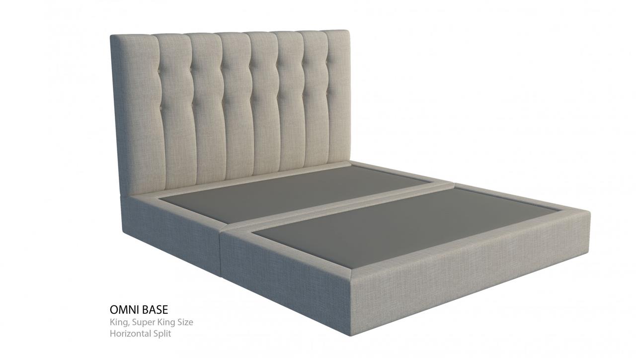 The Omni Ensemble Base is highly versatile and can fit into a range of room sizes. The King and Super King sizes are only available in either horizontal or vertical options. The base is 26cm thick with 9cm hidden legs or 7cm castors. The Omni Ensemble Bases have solid pine slates 8 x 2 cm and the gap between the slats is 7-8cm. On this model the slates are covered in a dust free fabric.