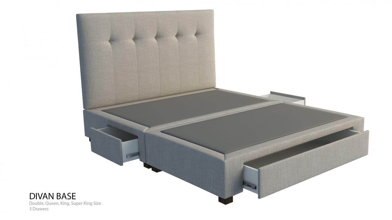 The Divan T4 Bed Base provides a highly practical storage space solution with built-in drawers of varying sizes. It is available in Double, Queen, King and Super King sizes, all of which have the base split horizontally, with one drawer on each side of the bed base, along with one longer draw at the foot end of the base.