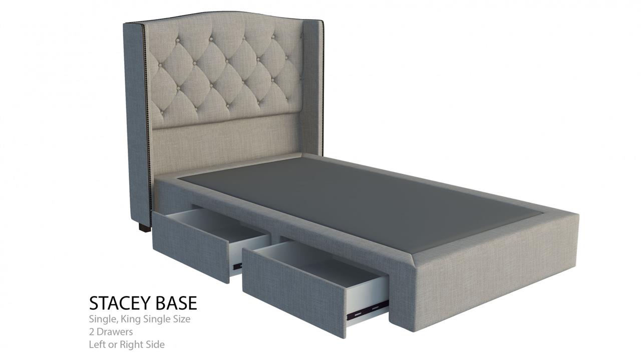 The Stacey Custom Drawer Upholstered Bed Base offers a modern storage space solution. This option is available in Double, Queen, King and Super King base with two deep drawers positioned on both the right and left-hand side of the bed base. If ordered as a Single or King Single size, the base is only available as a one piece with one drawer, positioned on either the right or left-hand side of the base.