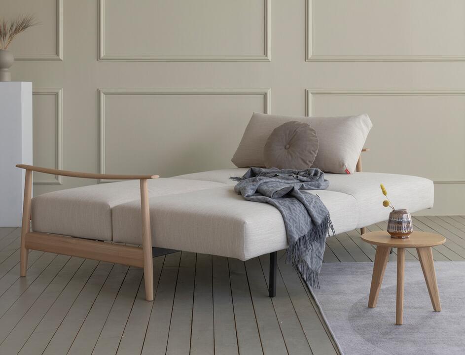 Designed by Per Weiss (2021), the Sabie Sofa Bed with Wood Arms combines modern lines with Scandinavian elegance. The use of natural materials like oak armrests enhances its sophisticated look, while the pocket spring comfort system ensures relaxation in both sofa and bed modes.