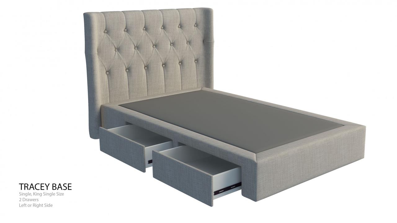 The Stacey Custom Drawer Upholstered Bed Base offers a modern storage space solution. This option is available in Double, Queen, King and Super King base with two deep drawers positioned on both the right and left-hand side of the bed base. If ordered as a Single or King Single size, the base is only available as a one-piece with one drawer, positioned on either the right or left-hand side of the base.