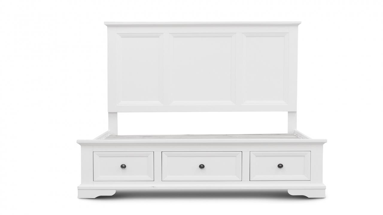 The Vienna Bed is a modern timber storage frame design evoking coastal holidays, with its whitewash finish, recessed panel inserts on the headboard and matt black round handles on drawers. Made from solid acacia timber and finished in pine and MDF there are 3 storage drawers in the foot end for your linens and smaller items. This is a contemporary-designed product suite that will suit anyone’s decor and is available in queen and king sizes (see measurements below) The Vienna bed frame sits on carved wooden legs and comes with a 12-month warranty. You can also order associated suite options including bedside drawers and a tallboy.