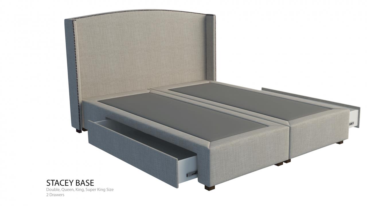 The Stacey Custom Drawer Upholstered Bed Base offers a modern storage space solution. This option is available in Double, Queen, King, and Super King base with two deep drawers positioned on both the right and left-hand side of the bed base. If ordered as a Single or King Single size, the base is only available as a one-piece with one drawer, positioned on either the right or left-hand side of the base.
